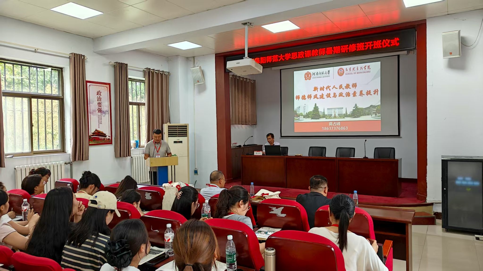 为全面贯彻党的教育方针,强化新时代教师队伍建设,阜阳师范大学马克思主义学院组织教师赴河南师范大学开展专题研修活动。8月9日下午,河南师范大学马克思主义学院党委书记、院长蒋占峰教授作《新时代人民教师师德师风建设与政治素养提升》专题报告,全体研修教师参加,马克思主义学院副院长赵永明主持活动。