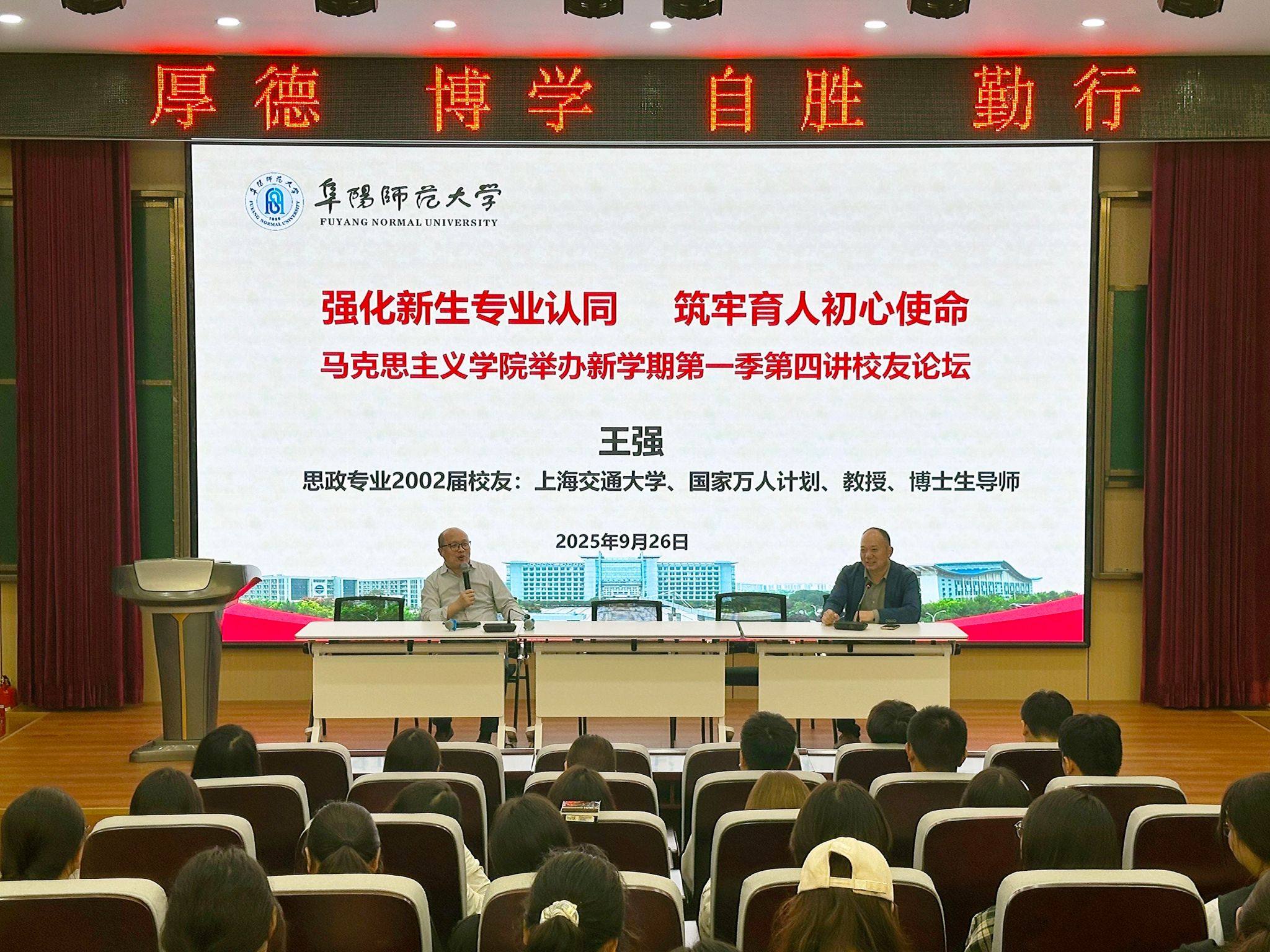 为强化新生专业认同,筑牢育人初心使命,切实增强2025级新生专业归属感与认同感,9月26日,马克思主义学院在西湖校区三区C楼多功能报告厅举办校友论坛第一季第四讲。论坛邀请我校2002届思政专业校友、国家万人计划上海交通大学长聘教授、博士生导师王强作关于专业认同的专题报告。马克思主义学院2025级思政专业的全体学生,学院教师参加了报告会。报告会由思政专业教研室主任李涛主持。