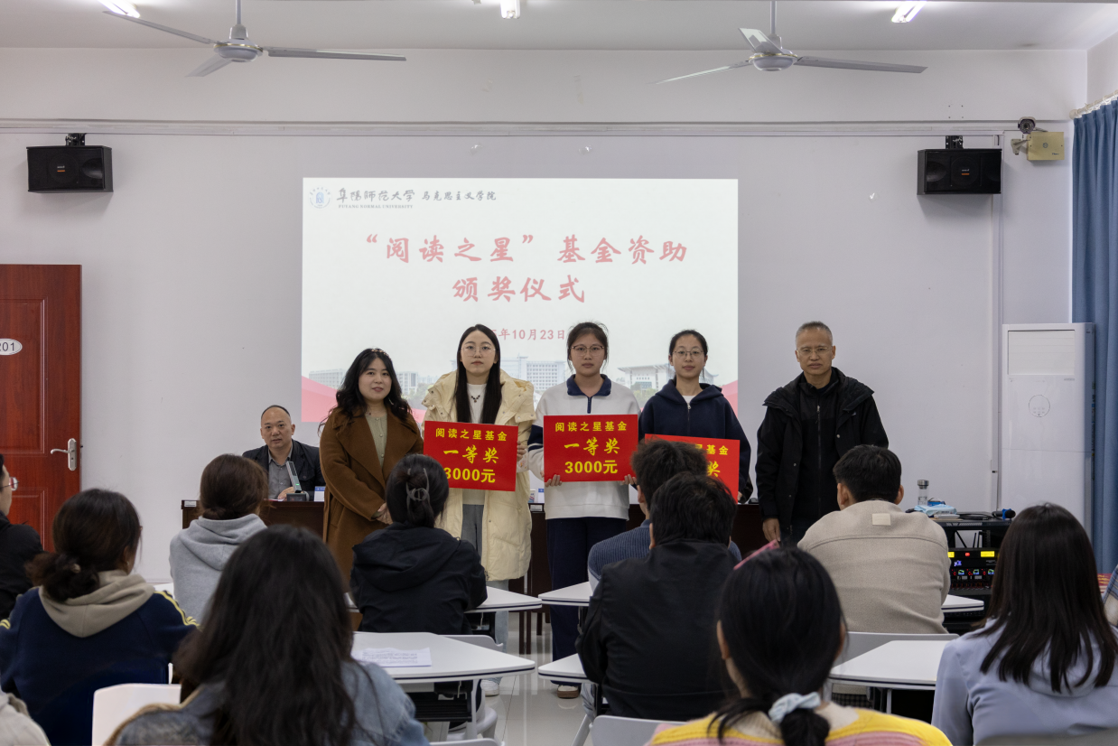 10月23日,在西湖校区三里桥校园马克思主义学院201会议室隆重举行首届“阅读之星”颁奖仪式。“阅读之星”助学基金由我校2008级思政专业优秀校友崔红玉捐助设立,每年资助金额伍万元,旨在表彰先进、树立榜样,营造“多读书、读好书”的阅读氛围。出席颁奖仪式的有马克思主义学院院长朱宗友、“阅读之星”助学基金捐赠人崔红玉、思政专业教研室主任李涛、学院团学负责人张涛和全体受资助同学以及部分学生代表,颁奖仪式由李涛主持。