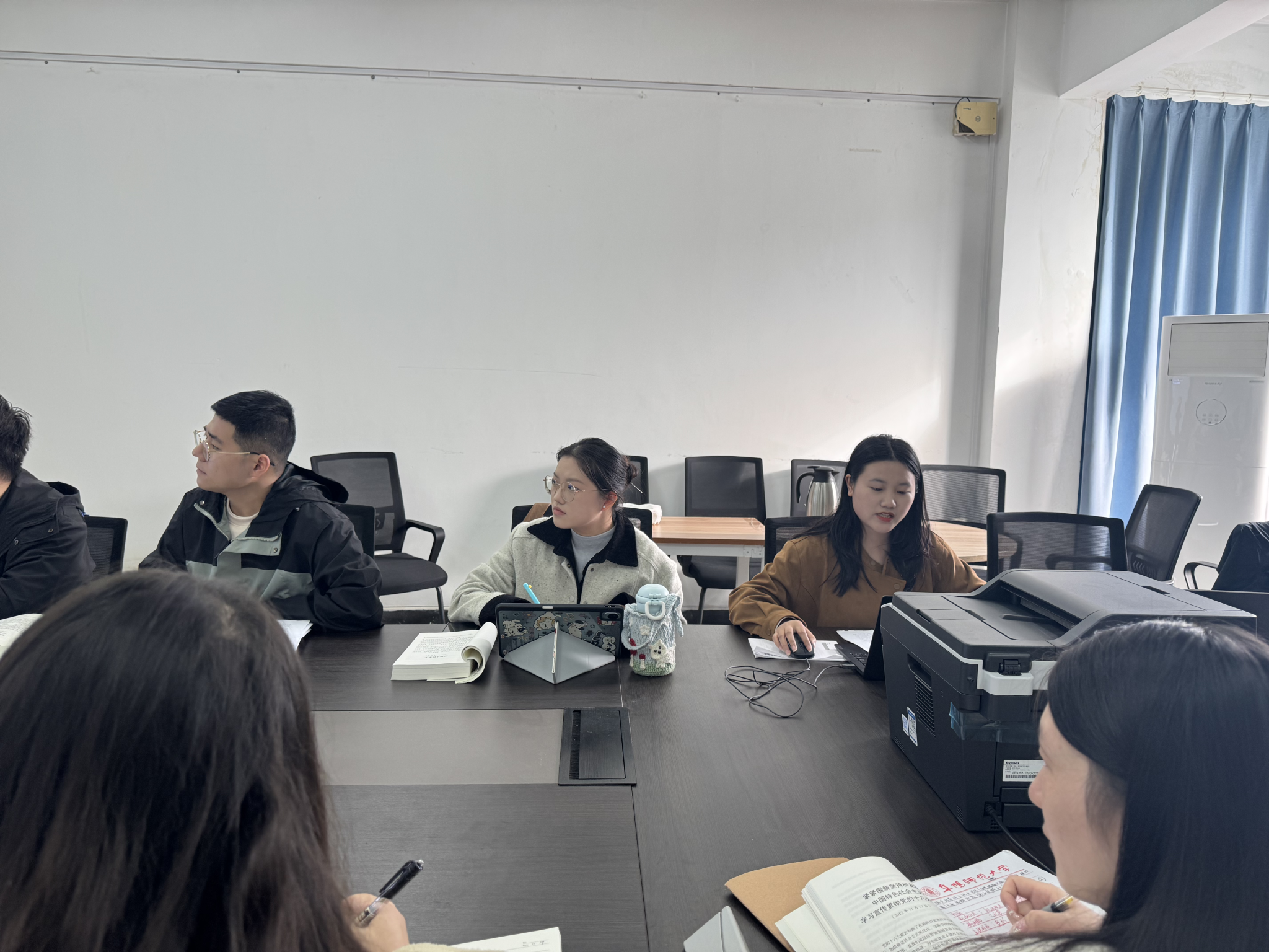 11月12日下午,中国高等教育学会马克思主义研究分会、中国李大钊研究会2025年度“马克思主义经典著作研读”中共党史党建专项支持计划——阜阳师范大学《习近平谈治国理政》读书小组,在马克思主义学院302会议室举办第五次线下读书活动。活动特邀中国高等教育学会马克思主义研究分会督导员周文渝、陈旭佳进行专项审查与指导。读书会由刘美晨同学主持,黄金林、汪志强、曹胜梅等14位读书小组成员参加,活动围绕前期活动总结汇报、深度读书分享、督导审查与互动交流三个核心环节有序展开。