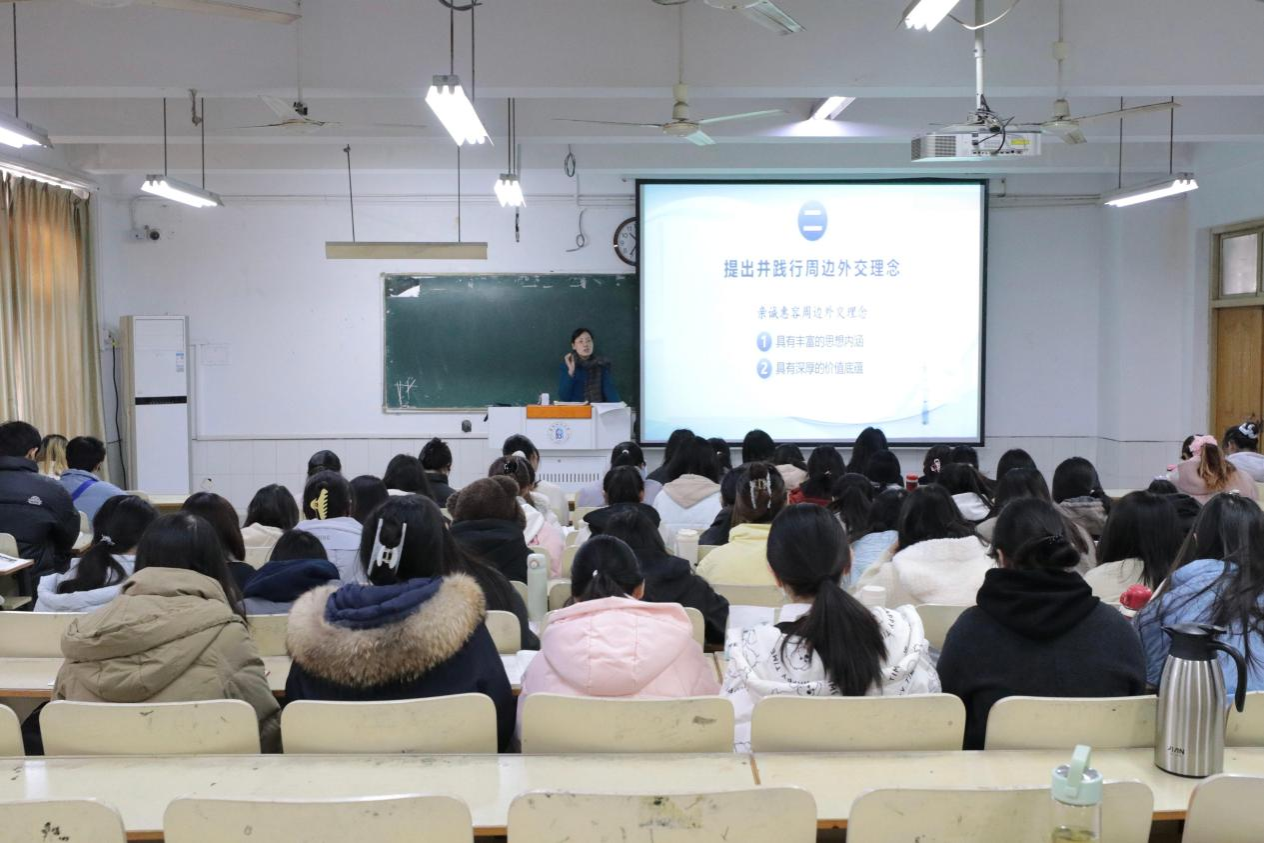 黄云志从2025年上半年国内外发生的大事着手,从“新形势下周边在外交全局中的重要性”“提出并践行周边外交理念”“新时代周边外交工作所取得历史性成就”“不断开创周边外交工作新局面”四个方面展开教学。课堂上,黄云志和同学们亲切互动,勉励同学们立足专业学习,拓展国际视野,增强跨文化交流能力。