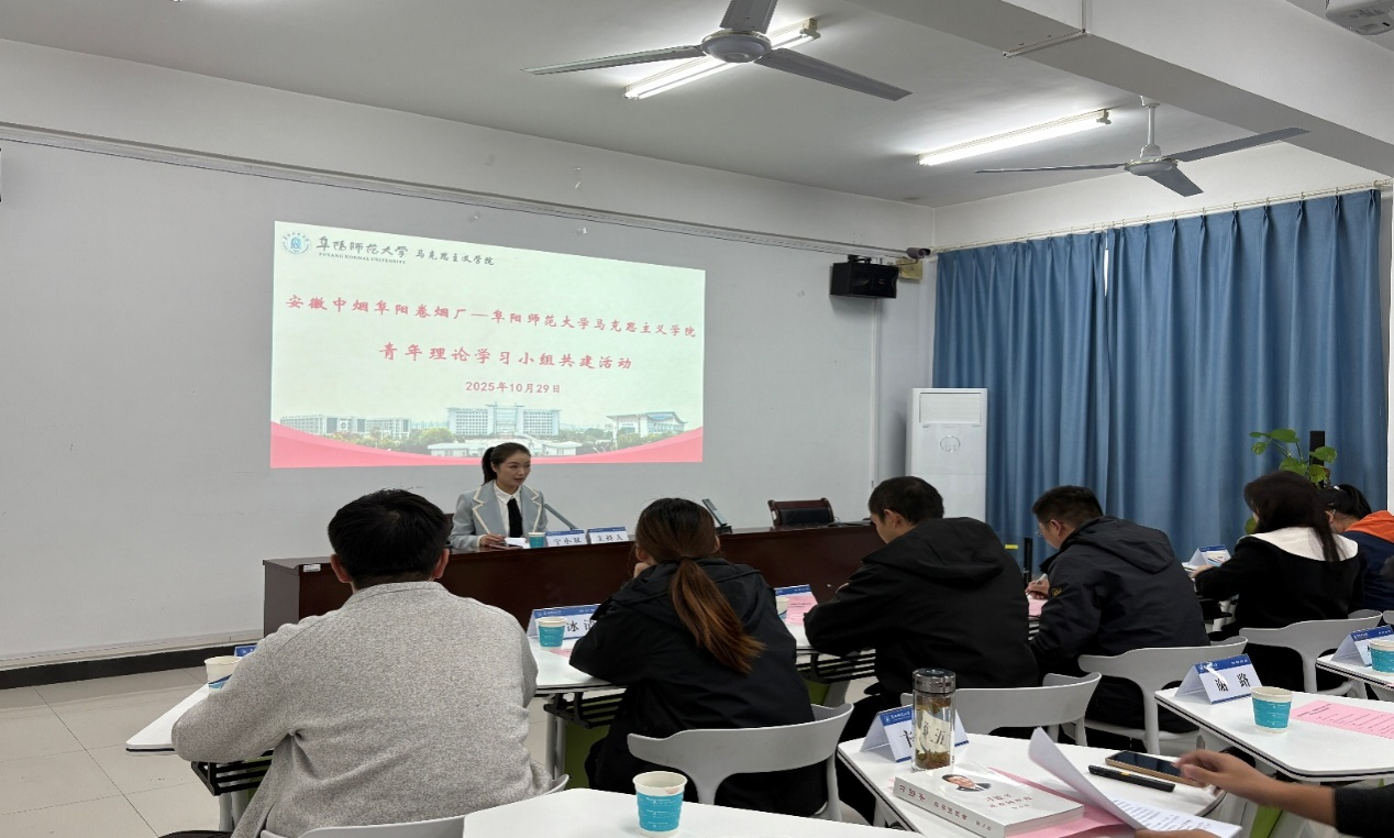 10月29日下午,我院与安徽中烟阜阳卷烟厂在201会议室联合举办“青年理论学习小组共建活动”。共建活动由宁小双老师主持,2025级学科教学(思政)专业硕士研究生参加共建活动。