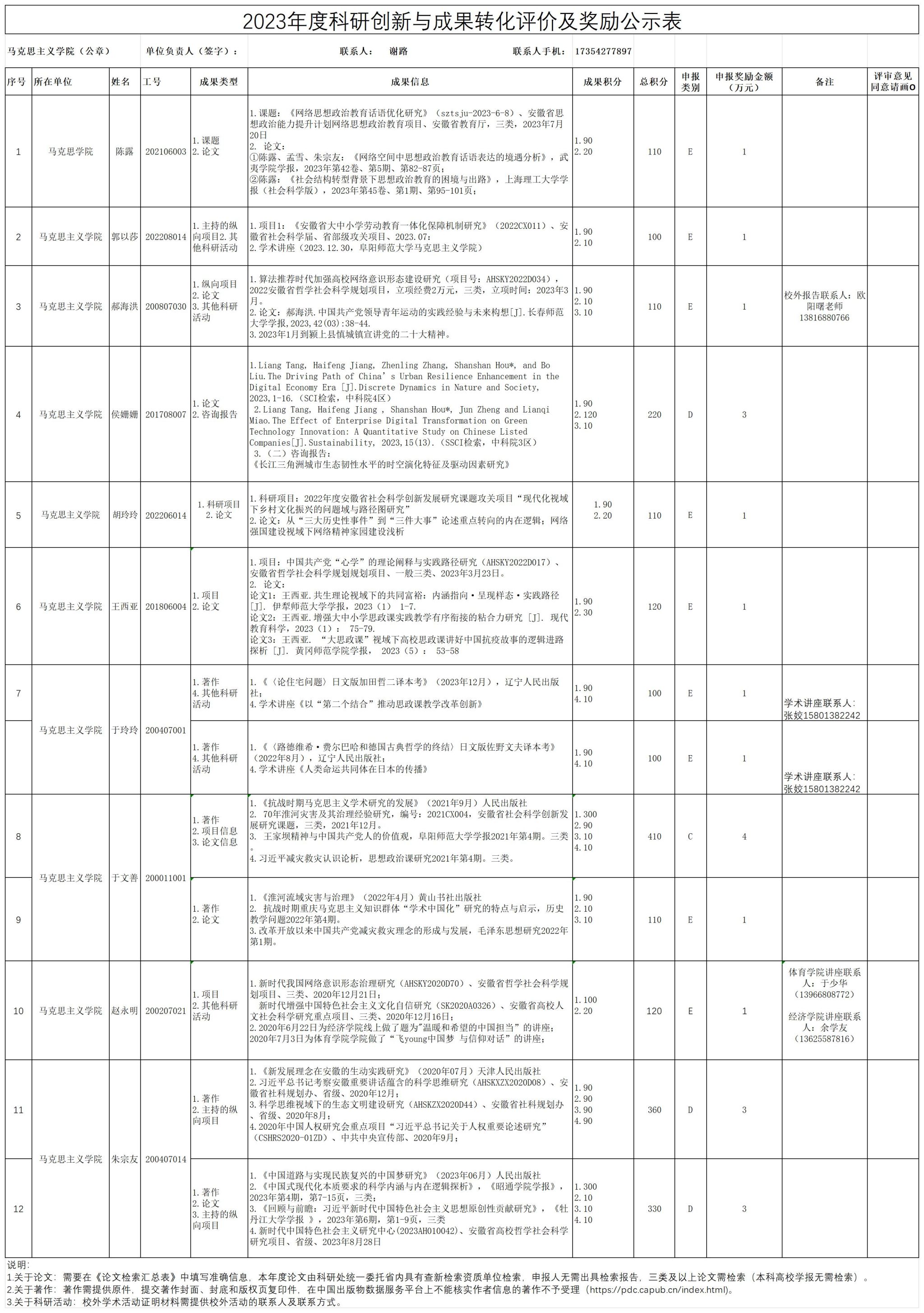依据《阜阳师范大学优秀科研成果奖励办法》(校科〔2020〕7 号)和《阜阳师范大学科研创新与成果转化评价及奖励办法(试行)》(校科〔2022〕30 号)文件要求,积极组织和开展马克思主义学院2023 年度科研创新与成果转化评价及优秀科研成果奖励工作,经个人申请、学院资格审查以及马克思主义学院学术委员会评审等程序,现将评审结果进行公示(公示期为2024年9月1日至2024年9月4日)。