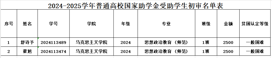 根据学校《关于做好2024-2025学年本科生国家助学金评选工作的通知》要求,按照《马克思主义学院国家奖助学金评审实施办法》规定,经个人申请、班级评议、学院评审工作小组评选、学院党委会议审议、学院党政联席会议决定,现对马克思主义学院2024-2025学年国家助学金推荐候选人予以公示。