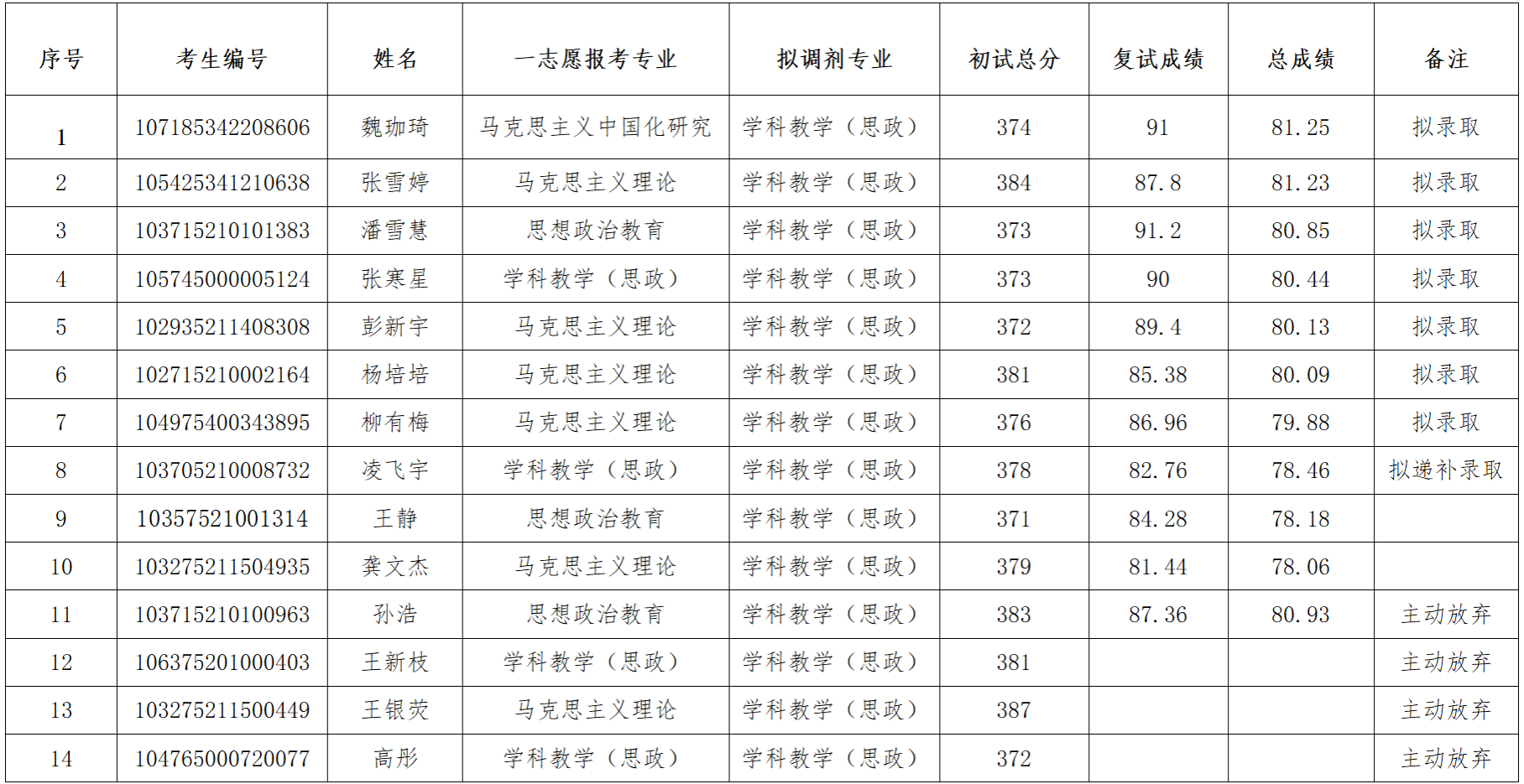 根据教育部《关于印发<2025年全国硕士研究生招生工作管理规定>的通知》(教学〔2024〕4号)《关于做好2025年全国硕士研究生复试录取工作的通知》(教学司〔2025〕4号)《关于进一步规范全国硕士研究生招生调剂工作的通知》(教学司〔2025〕5号)和安徽省高等学校招生委员会 安徽省教育厅《关于做好安徽省2025年硕士研究生复试录取工作的通知》(皖招委〔2025〕2号)等相关文件要求,按照阜阳师范大学马克思主义学院2025年硕士研究生复试录取工作方案,现将我院2025年学科教学(思政)专业全日制硕士研究生第一次调剂拟录取名单公示如下: