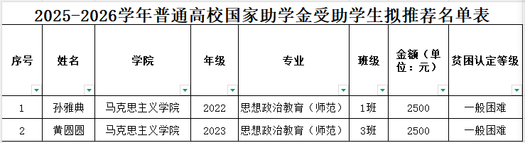 根据学校《关于做好2025-2026学年本科生国家助学金评选工作的通知》要求,按照《马克思主义学院国家奖助学金评审实施办法》规定,经个人申请、班级评议、学院评审工作小组评选,现对马克思主义学院2025-2026学年国家助学金推荐候选人予以公示。