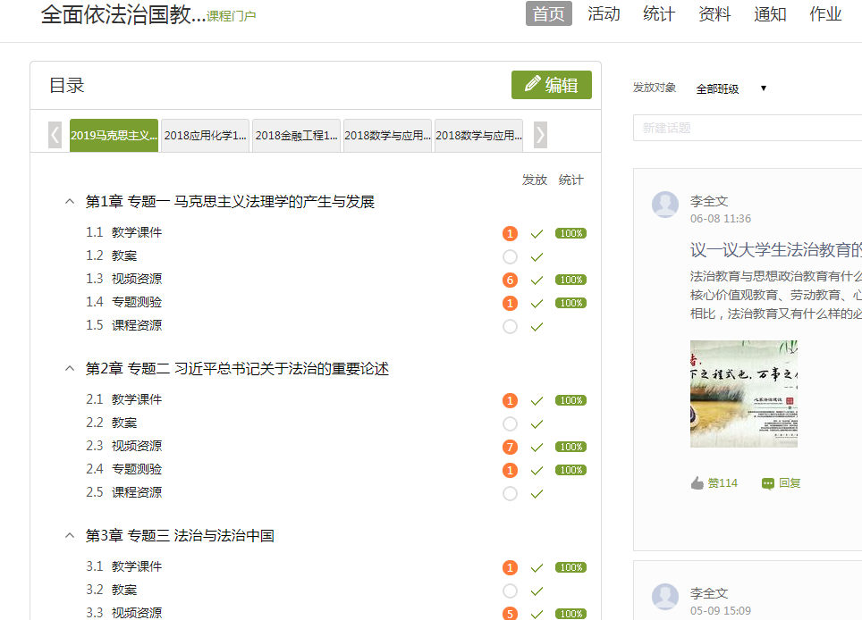 研讨会上,法治教育教学团队介绍了本学期专题教学的方法与内容、成效与展望。运用学校泛雅网络教学平台,自建法治教育课程,将线上授课与课堂活动、线下自学与社会实践等有机结合。组建4人教学团队,已建成“习近平总书记关于法治的重要论述”等6个教学专题资源体系,马克思主义学院等6个学院13个专业1000多名研究生和本科生参与学习,教师在线总课时数近200个。通过问卷调查与平台统计数据分析,学生满意度较高,学习效果与预期基本一致。教学团队表示,继续总结经验,加快课程平台建设,丰富优化专题资源。