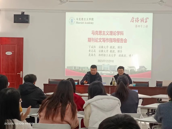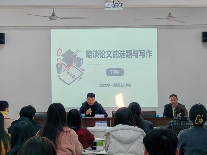 为提升学院教师和研究生期刊论文写作水平,规范学术文章写作,12月9号下午,我院特邀安徽大学丁成际教授,安徽大学黄志高教授,郑州轻工业大学聂海杰副教授作马克思主义理论学科期刊论文写作指导报告会。报告在阜阳师范大学三里桥校园201会议室举行,赵永明教授主持,马院全体研究生到场聆听。