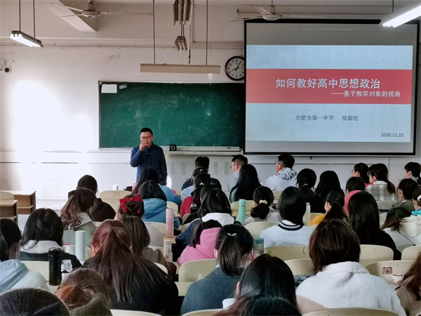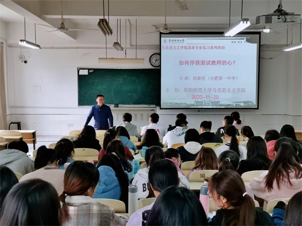 11月20日,马克思主义学院邀请合肥一中思政教育研究中心主任侯新旺,在西湖校区景行楼211教室就 “如何教好高中思想政治”“新时代思政课教师的自我修养”“如何俘获面试教师的心”作思政报告。马克思主义学院2018级、2019级思想政治教育专业的全体同学聆听讲座。讲座由马克思主义学院于晓娟老师主持。马克思主义学院副院长朱宗友、思想政治教育教研室主任宋俊义参加活动。