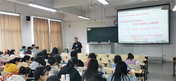 为落实思政专业人才培养方案,提高学生的教学专业素养,在学校统一部署和马克思主义学院安排下,2020年11月19日,马克思主义学院于西湖校区景行楼211教室举办了以“争做新时代初中思政人,讲好立德树人关键课程”为主题的讲座,邀请阜阳第十五中学刘启伟老师主讲。思政教研室主任宋俊义出席本次讲座,2018级、2019级思政专业的学生聆听了此次讲座。