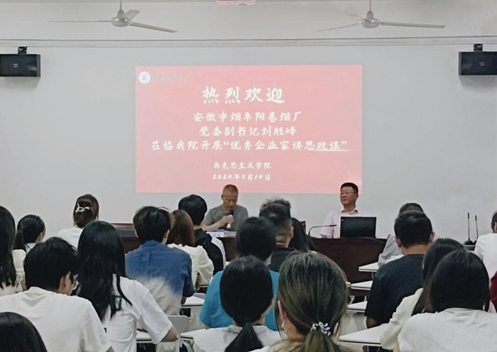 为响应党对国家劳动教育工作教育的部署,着力构建新时代大学生劳育工作体系,坚持立德树人根本任务,培养学生正确的劳动教育观,5月14日上午,学院邀请安徽中烟阜阳卷烟厂党委副书记刘胜峰在马克思主义学院三里桥校区201会议室举办“优秀企业家讲思政课”专题报告会。思政专业学生代表和部分研究生参加报告会,会议由学院院长朱宗友教授主持。