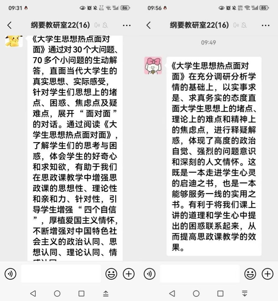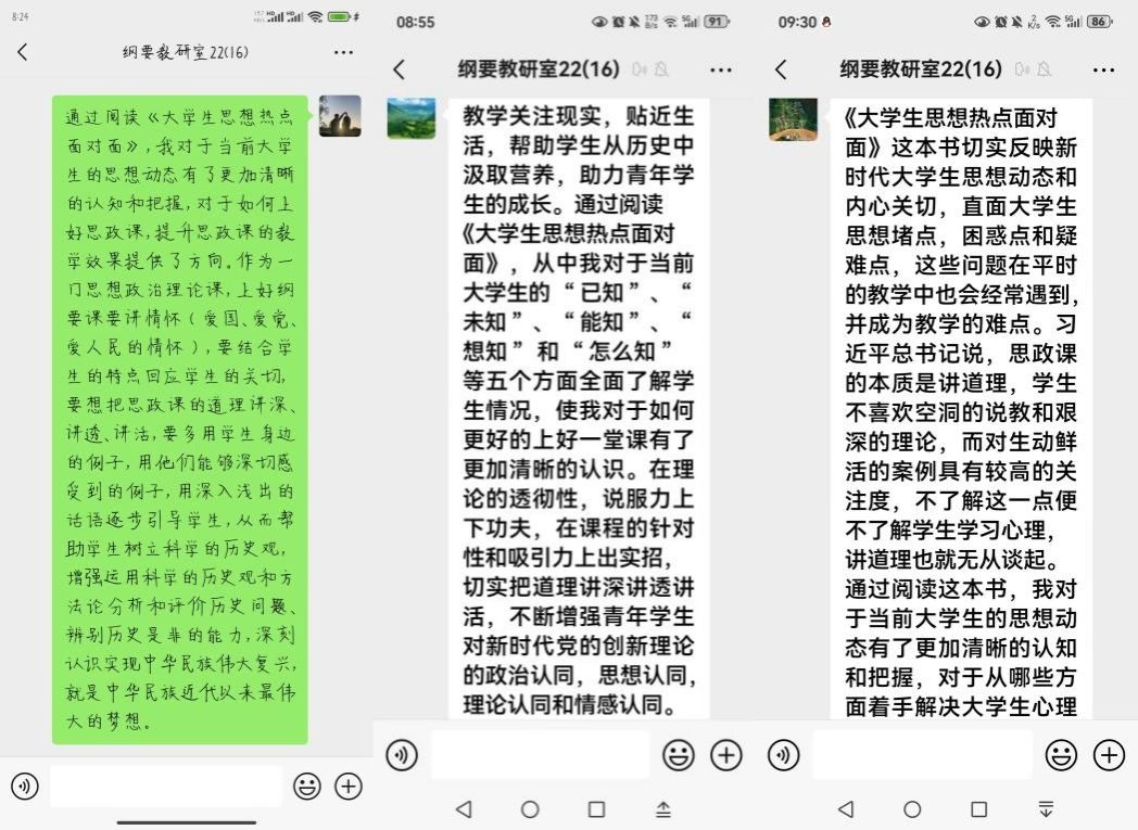 大家以线上线下相结合的方式认真研学《大学生思想热点面对面》,并在教研室微信群自觉分享学习心得,围绕该书主要内容与思政课教学实际积极进行研讨交流。大家一致认为,教育部社科司组织编写的《大学生思想热点面对面》,是在广泛调研后选取了30个大问题、70个小问题,不仅紧紧抓住学生普遍关注的社会热点问题和存在的深层次思想理论困惑,切中学生的成长发展实际需求,而且还运用通俗易懂、简洁清新的话语,答疑解惑,对于打通价值观育人的“最后一公里”具有积极作用,也为推动思政课教学范式和话语叙事方式转变提供了重要借鉴。大家明确表示,作为高校思政课教师要在日常教学中善于发挥新时代伟大成就的教育激励作用,丰富教学内容,改进教学手段,讲好新时代故事;以“大思政课”拓展全面育人新格局,把思政小课堂和社会大课堂结合起来,努力构建思政课实践育人支撑体系,推动思政课成为一门推动广大青年学生不断增强对中国特色社会主义的政治认同、思想认同、理论认同、情感认同的高校必修课,从而实现教育引导青年学生自觉成长为让党放心、爱国奉献、担当民族复兴重任的时代新人的使命。