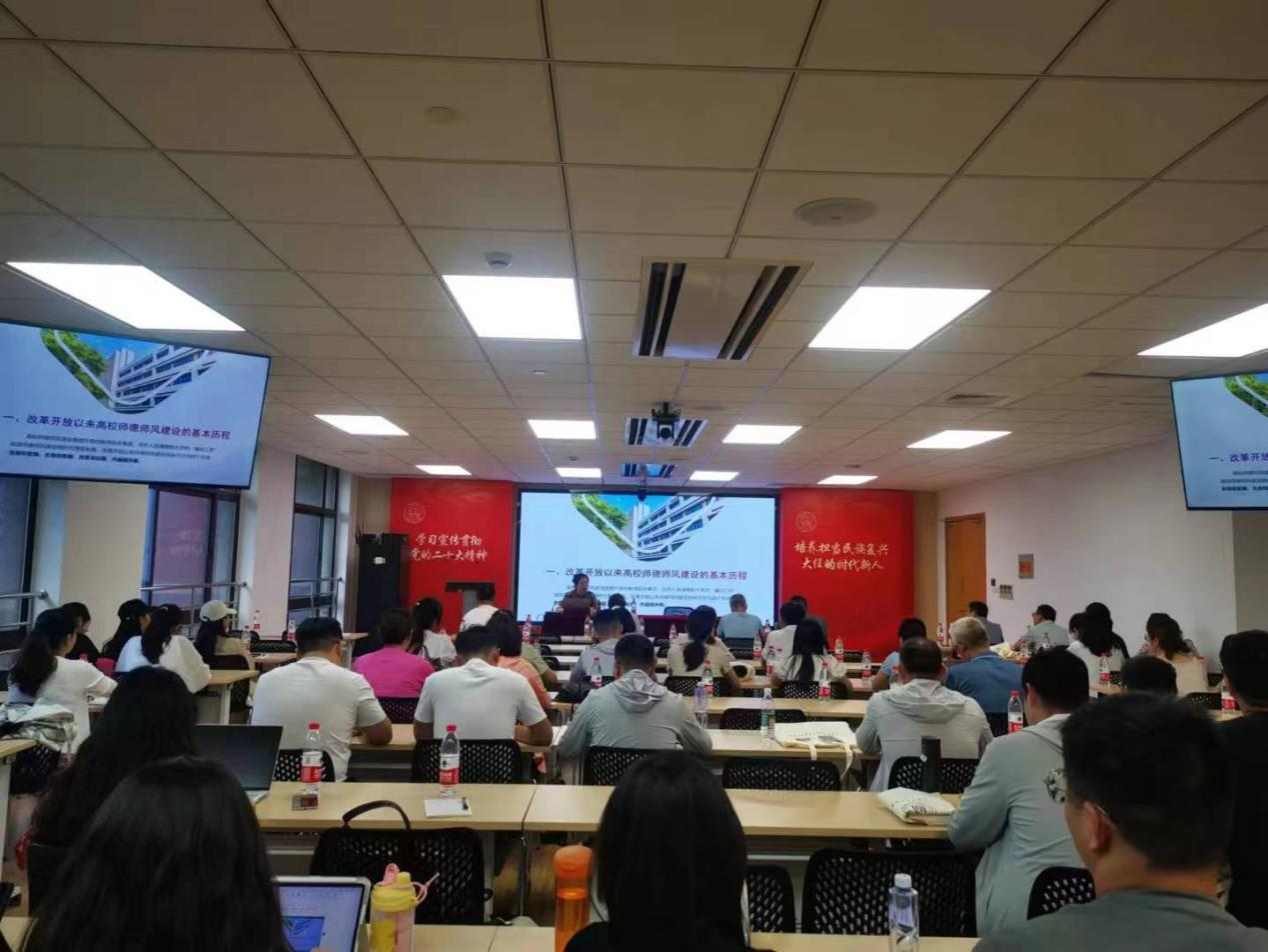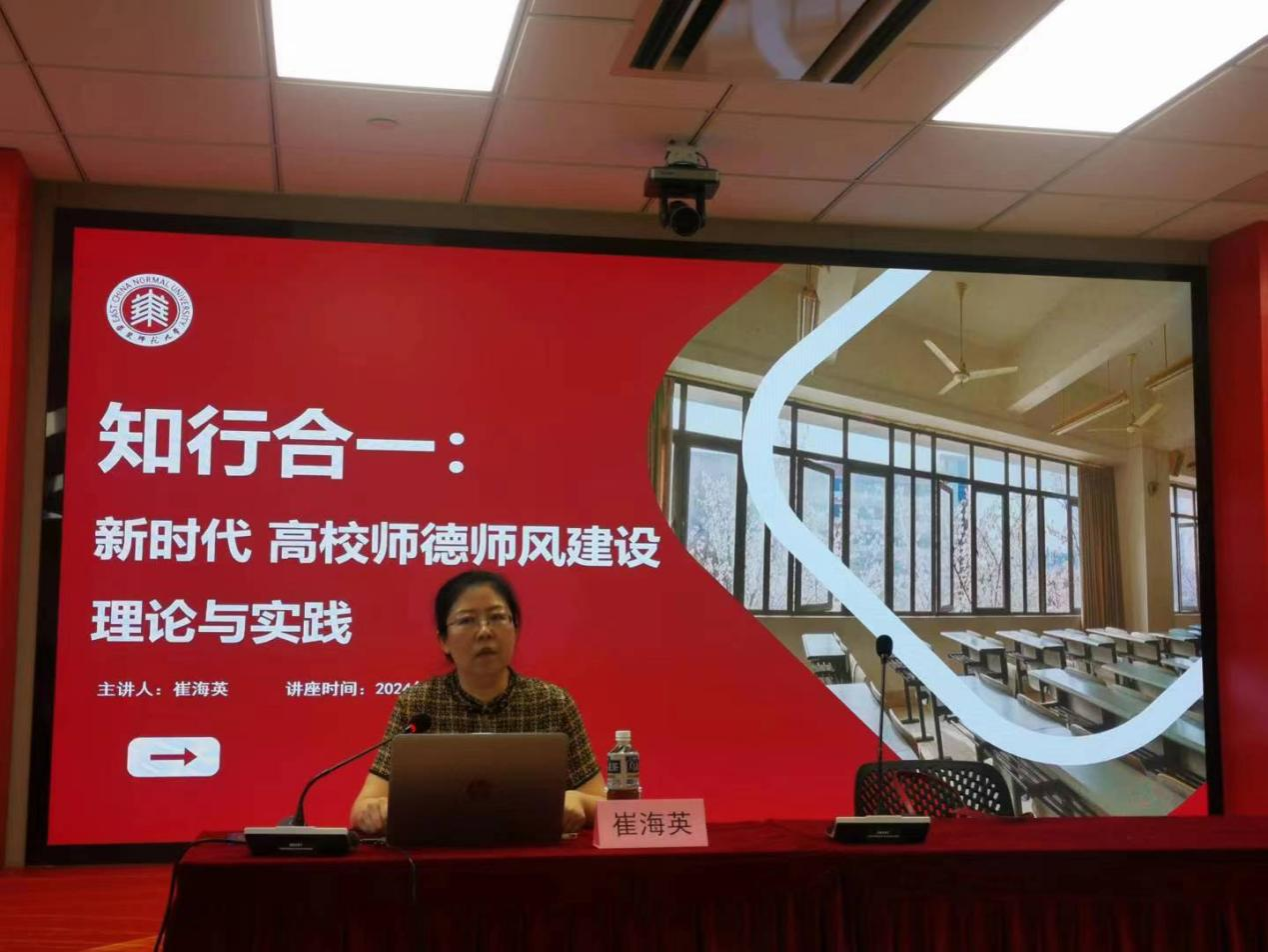 7月29日下午在上海师范大学东部文科实验楼202会议室,华东师范大学教授、博士生导师崔海英,作了“知行合一:新时代高校教师师德师风建设理论与实践”专题辅导报告。旨在进一步加强学院教师的师德师风建设,强化思想铸魂,提升队伍素养,不断推动思政课教师高素质专业化发展。