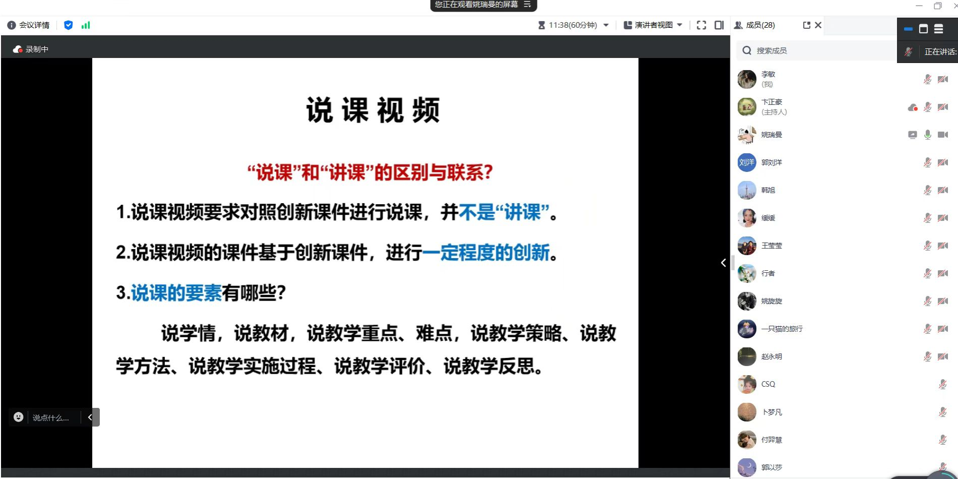 姚瑞曼博士结合自身的教学经历和参赛经验,从精准把握竞赛要求、选专题和取标题的策略、如何把握教学设计的亮点、现场展示环节把握的原则等四个方面进行了详细地阐述。