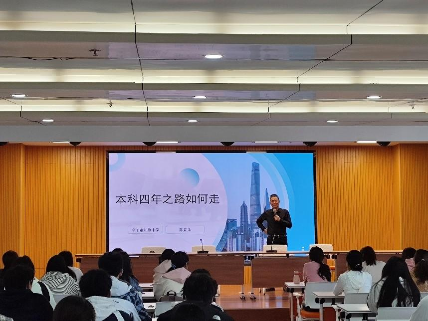 14日上午在三里桥校园Z楼7楼报告厅,学院邀请正高级教师阜阳市红旗中学陈荒龙副校长,为2024级学生作“大学之路如何走”主题报告,陈荒龙结合自身的经历,从高考录取、生涯规划、持续努力、全面发展等七个方面,告诫同学们要兼顾理想和现实,做最好的自己。