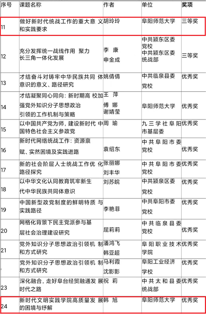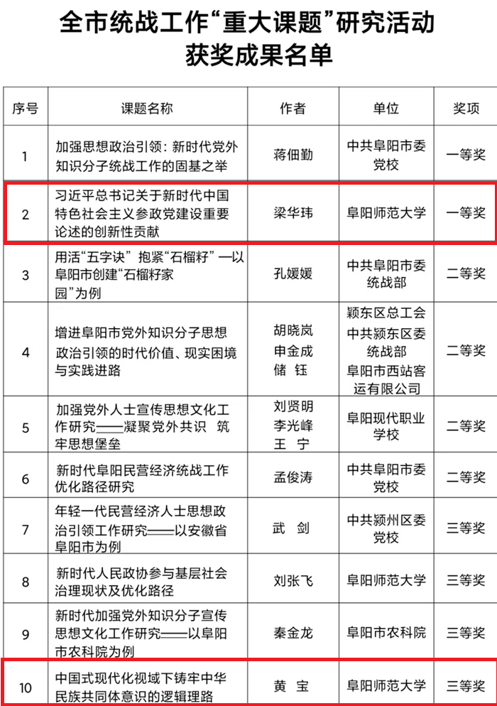 近日,阜阳市委统战部、市社科联开展全市统战工作“重大课题”研究优秀成果评选揭晓,我院共四名教师入选获奖名单。