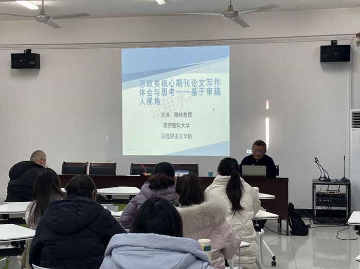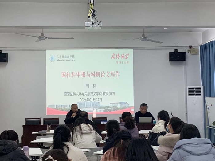 为提高我院师生的科研水平和学术论文写作能力,2024年1月4日下午,马克思主义学院邀请南京医科大学马克思主义学院博士生导师陶林教授作题为《国家社科申报与科研论文写作》的学术报告,报告在马克思主义学院201会议室进行,学院党委副书记、院长朱宗友主持,全院研究生和青年教师参加。
