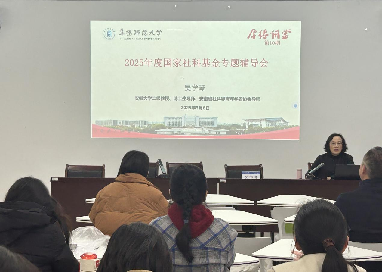 为扎实推进国家社科基金项目申报工作,有效提高科研项目申报质量,3月6日下午,马克思主义学院邀请了国家特殊支持计划哲学社会科学领军人才、安徽省学术技术带头人、安徽大学二级教授吴学琴作国家社科基金专题辅导。此次辅导会由安徽省社科界青年学者协会主办,校科研处和马克思主义学院承办,学院副院长赵永明主持,马院部分教师参加。