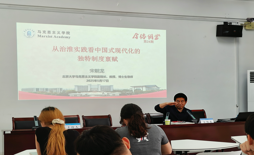 为深化青年学子对中国式现代化的理论认知,进一步提高学术水平和科研能力,5月17日,学院特邀北京大学马克思主义学院副院长、博士生导师宋朝龙教授,在学院201会议室作题为《从治淮实践看中国式现代化的独特制度禀赋》的专题报告。报告由我院党委副书记、纪委书记徐朝东主持,马克思主义学院、历史文化与旅游学院研究生参会学习。