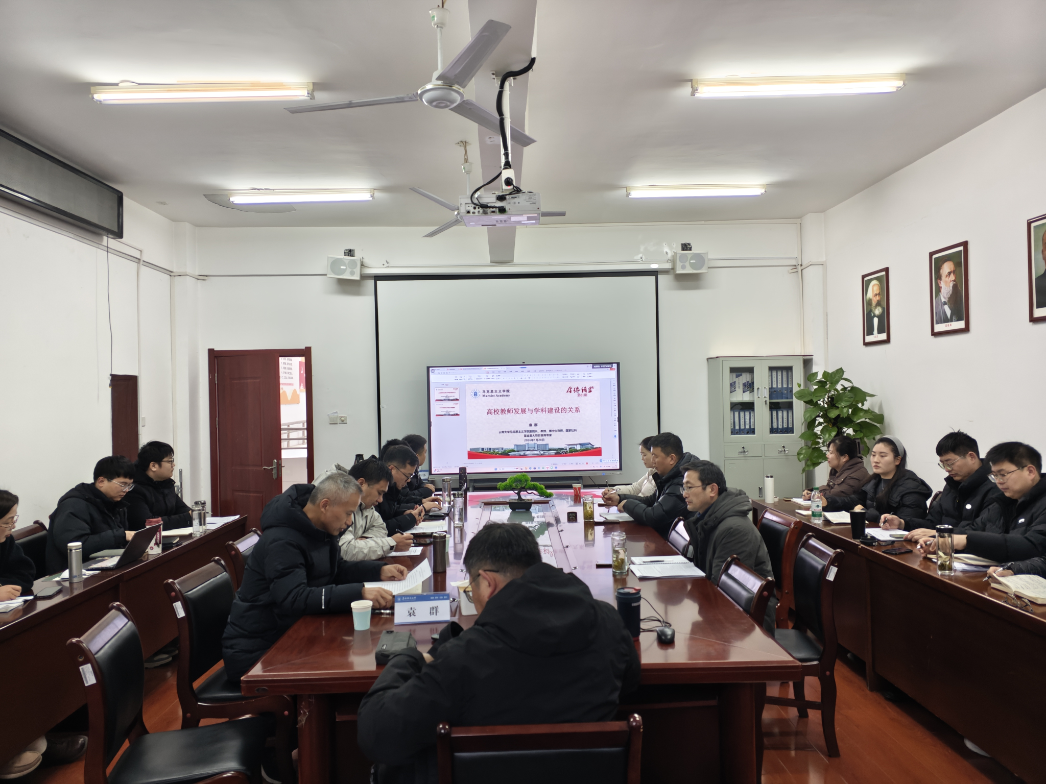 为提升我院教师科研能力,助力学科建设与发展,1月28日我院邀请了云南大学马克思主义学院袁群教授在学院211会议室作了题为《高校教师发展与学科建设的关系》及《2026年国家社科基金申报辅导》的专题讲座。会议由学院院长朱宗友主持,我院副院长赵永明、部分教师参加辅导报告会。