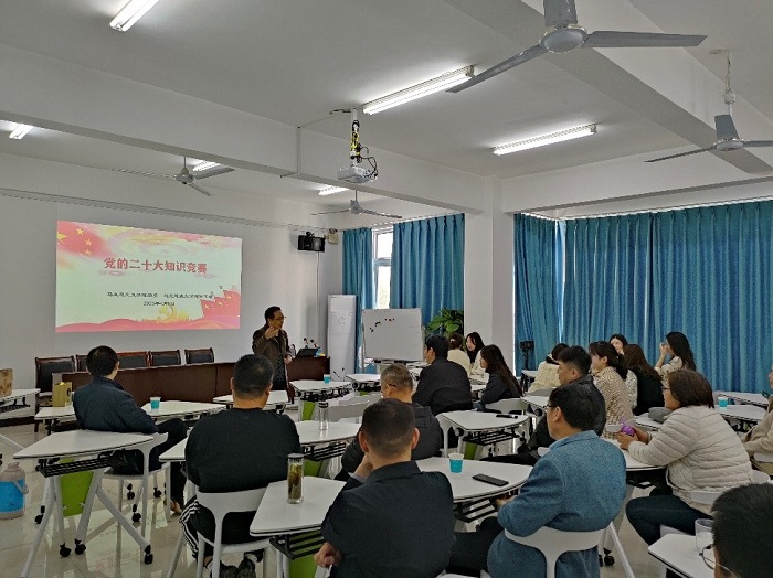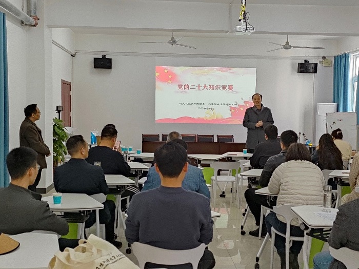 为学深悟透习近平新时代中国特色社会主义思想和党的二十大精神,强化党建引领,提升学院教师理论水平,2023年4月8日上午,马克思主义学院党委、马克思主义学院分工会在阜阳师范大学三里桥校园举办党的二十大知识竞赛。学院党委书记高思杰,党委委员、副院长朱宗友,30多位思政课教师选手参加。学院分工会主席杨军主持。