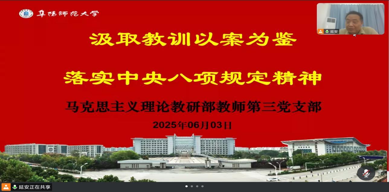 为深入贯彻中央八项规定精神学习教育,进一步强化党风廉政建设,提升党员纪律意识,6月3日下午马克思主义学院马克思主义理论教研部教师第三党支部召开专题学习会议,深入学习中央公开通报的党员干部违规吃喝严重违反中央八项规定精神典型问题案例,为党员敲响纪律警钟,筑牢思想防线。会议由党支部书记杨军主持,全体党员参加。