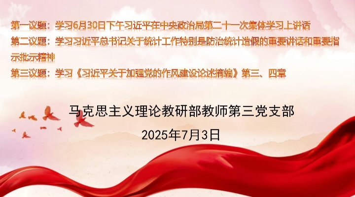 为深刻领会新时代党的建设总要求,持续深化作风建设,树牢以人民为中心的发展思想,强化纪律意识,马克思主义学院马克思主义理论教研部教师第三党支部于7月3日下午召开专题学习会,深入学习研讨6月30日下午习近平总书记在主持中央政治局第二十一次集体学习时发表的重要讲话精神、习近平总书记关于统计工作特别是防治统计造假的重要讲话和重要指示批示精神,以及《习近平关于加强党的作风建设论述摘编》第三章和第四章有关内容。会议由支部委员吕自密主持,支部全体党员参加。