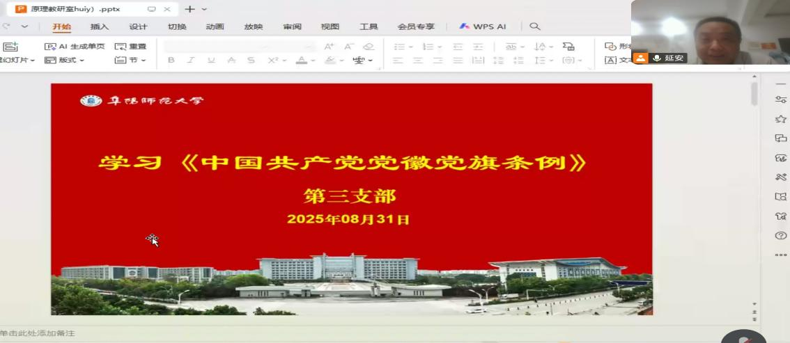 为教育引导全体党员深刻认识党徽党旗的神圣与庄严,自觉做党徽党旗的尊崇者和守护者,8月31日,马克思主义学院教师第三党支部组织召开线上专题学习会,集中学习《中国共产党党徽党旗条例》(以下简称《条例》)。会议由支部书记杨军主持,支部全体党员参加。