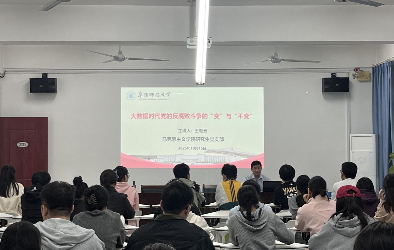 10月15日晚,马克思主义学院研究生党支部在学院201会议室召开大会,党支部书记王继云为全体党员做了“大数据时代党的反腐败斗争的‘变’与‘不变’”主题党课。