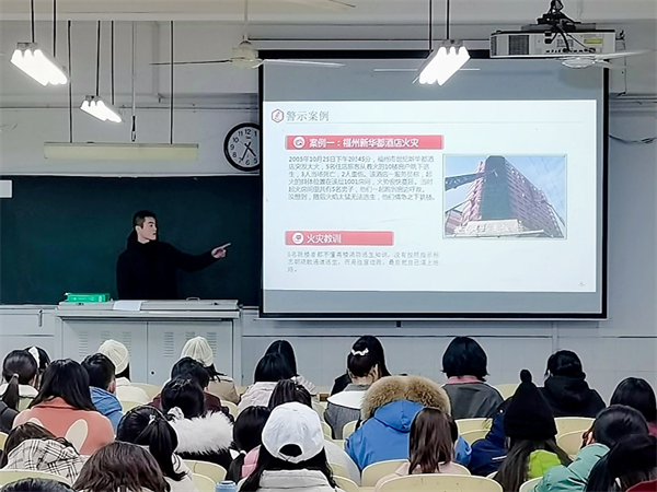 讲座伊始,洪寅达通过PPT展示,结合火灾事故案例,向同学们详细讲解预防火灾的基本常识、日常火灾防范措施、逃生自救注意事项及灭火器的构造、使用方法等,提醒大家应该提高消防安全意识,加强日常的消防安全检查工作。