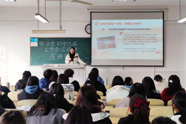为更好学习党的十九届五中全会精神,11月27日上午,马克思主义学院在主楼409教室召开学习党的十九届五中全会精神座谈会,特邀宁宇涵老师主讲,马克思主义学院团总支负责人黄宝老师及学生干部参加座谈。宁宇涵老师从“充分认识党的十九届五中全会召开背景”“准确把握全面建成小康社会取得的决定性成就”“深刻领会‘十四五’时期经济社会发展指导思想、遵循原则和主要目标”“全面贯彻落实‘十四五’时期工作要求”四个方面展开全面深入宣讲,引导同学们学深悟透全会精神,让同学们明晰了学习重点,抓住学习核心内容。
