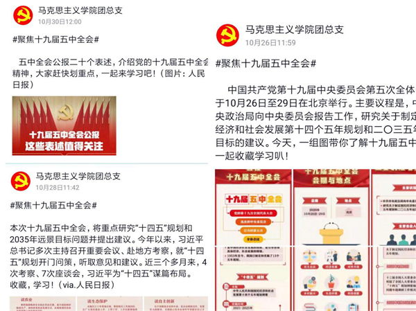 10月26日至11月27日,马克思主义学院组织开展主题团日系列活动,通过“网络宣传教育”“专题座谈会”“主题班会”等项活动,深入学习领会党的十九届五中全会精神,切实增强大学生的使命感和责任感。