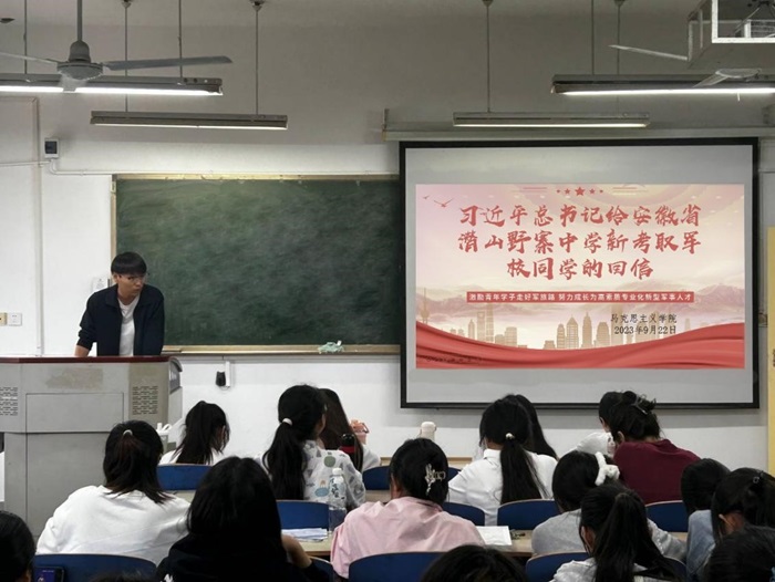 为认真学习贯彻习近平总书记给安徽省潜山野寨中学新考取军校同学的重要回信精神,全面落实立德树人根本任务,进一步增强大学生的国防意识和家国情怀,培养担当民族复兴大任的时代新人。10月8日,我院团总支开展学习贯彻习近平总书记重要回信精神主题团日活动。