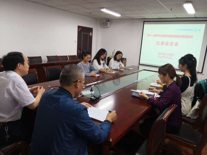 为促进师范生教学技能和教师教育水平的提升,加强学生实践应用能力,更好动员我院学生以赛促学、以赛促教、以赛促研,2020年9月28日,马克思主义学院于正行楼912会议室举行第十一届师范生教学技能竞赛暨省赛选拔赛动员会。马克思主义学院院长闫成俭、副院长朱宗友、于晓娟老师出席会议,六位参赛选手参加此次会议。