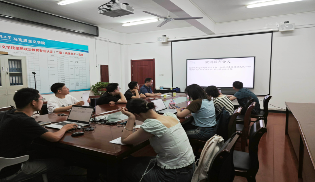 三位研究生樊雪、杨璞、韦聪依次分享读书感悟。樊雪从“写作背景、主要内容、当代价值”三个方面对恩格斯的《论权威》进行解读,阐述了马克思主义的权威观。杨璞从“毛泽东提出马克思主义中国化的原因、共产国际七大与马克思主义中国化的关系、延安时期马克思主义中国化发展脉络”三个方面对延安时期中国共产党人对马克思主义中国化的认识进行心得分享。韦聪则围绕《论欧洲联邦口号》的主题,介绍了欧洲联邦含义以及由来、并对主要内容进行个人观点分享。