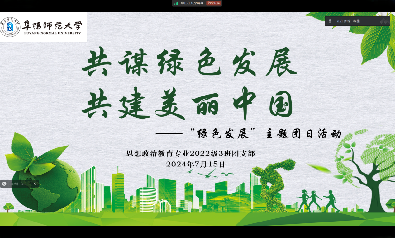 7月15日,马克思主义学院团委在线上举办了“共谋绿色发展,共建美丽中国”主题团日活动。活动由2022级思政专业3班团支部主办,团支书程静主持。