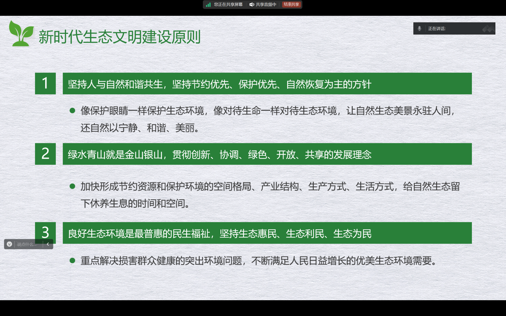 活动伊始,程静介绍了本次活动的主题和目的,强调了新时代生态文明建设原则以及绿色发展对于建设美丽中国的重要意义。随后,团员们通过线上平台共同观看了一系列有关绿色发展的视频资料,深入了解了我国在生态环境保护、可持续能源利用等方面取得的显著成就以及面临的挑战。