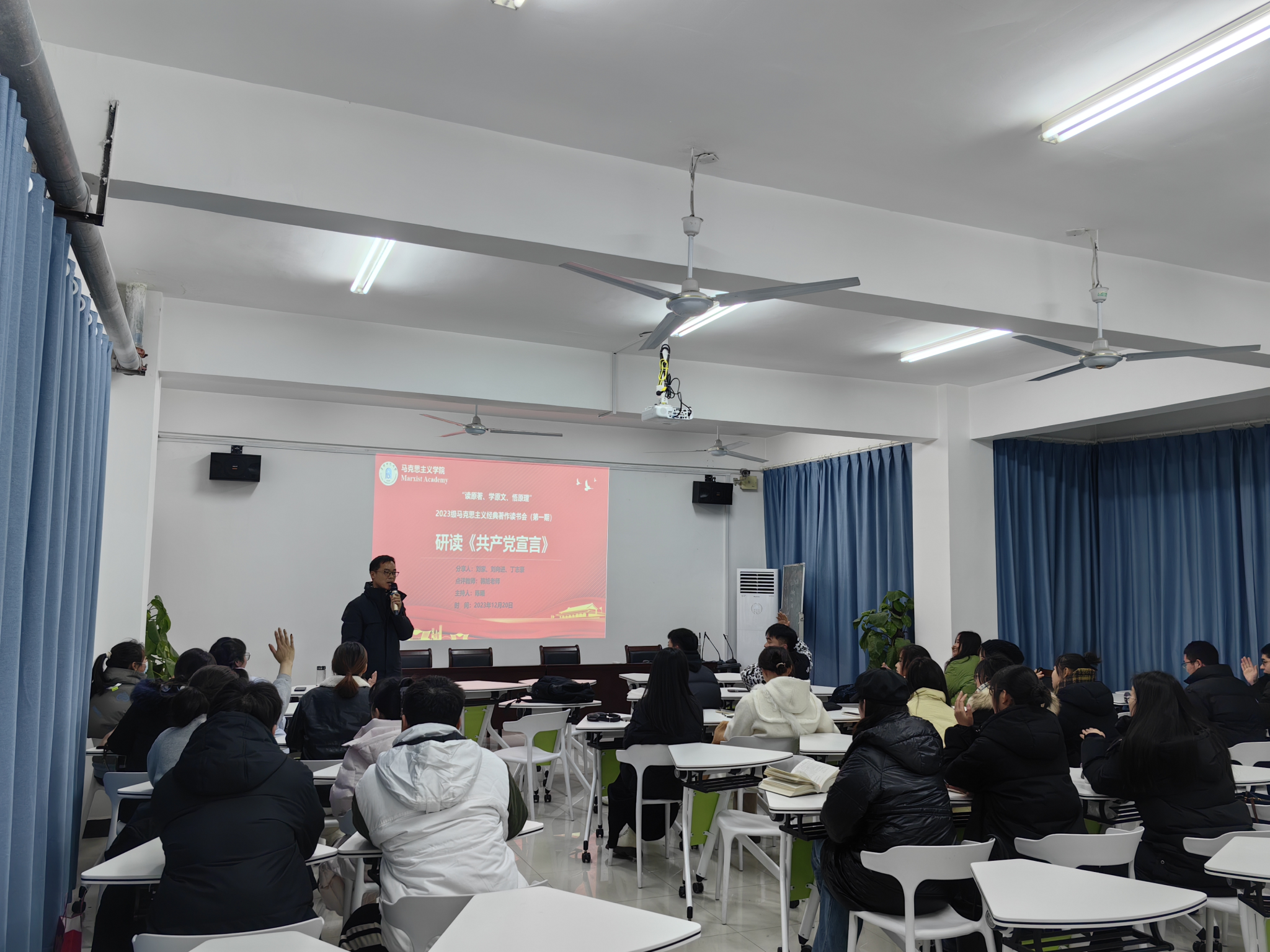 为增强我院研究生学术知识获取能力,培养学术智慧和增强学术道德,营造爱读书、读好书、善读书的浓厚氛围。2023年12月20日下午,学院2023级研究生举办了第一期“马克思主义经典著作读书会”。本次读书会在学校三里桥校区学院201会议室举行,2023级全体研究生参加,韩旭老师到场指导,会议由2023级研究生陈曦主持。