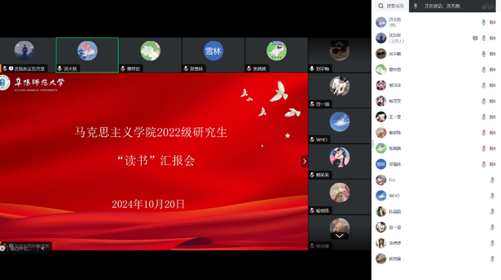 为营造我院学子读好书、善读书的优良学风氛围,鼓励同学们阅读经典,从阅读中汲取力量,10月20日,2022级研究生开展了一次读书汇报会。此次汇报会由沈加友同学主持,洪天然、张腾腾和刘宇畅三位同学主讲,2022级全体研究生参加。