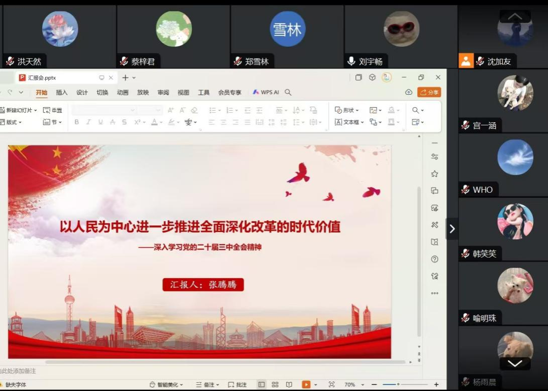 张腾腾从唯物史观角度阐述了人民主体地位的理论,她从丰富发展唯物史观关于人民主体地位理论、创新历史唯物主义话语体系、进一步为全面深化改革提供原则遵循和实践要求三个方面入手,系统阐述了全面深化改革必须坚持以人民为中心的价值导向。洪天然从大别山红色文化入手,通过介绍大别山红色文化的资源价值、皖西地区乡村振兴的现状与机遇、大别山红色文化助力皖西乡村振兴的现实路径,启示大家要自觉传承大别山红色文化,躬耕践行,做新时代的奋斗者。刘宇畅就《新科学》这一著作系统论述了维科关于世界历史的思想,阐述了其对人类世界历史观念发展的积极意义。