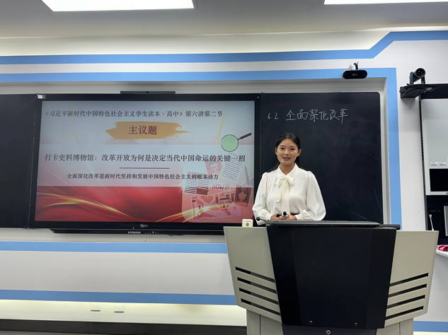首场活动为示范课展示。周子越、朱珠和王卓凡三位同学分别于6日、13日和15日受邀前来马克思主义学院303和102教室做示范课。周子越同学围绕“全面深化改革开放”这一主题展开教学,讲解深入浅出,逻辑条理清晰。她通过巧妙的问题设计,引导同学们深入课堂讨论,营造了良好的师生互动氛围,使课堂气氛异常活跃。