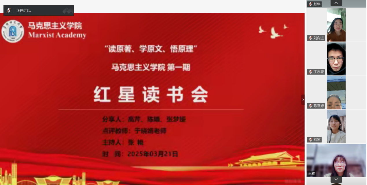 为加深同学们对马克思主义经典著作的理解,激发大家的学习热情,营造良好的学术氛围,3月21日下午,院研究生会协助2023级研究生在线上举办了红星读书会活动。活动特邀学院硕士生导师于晓娟副教授进行指导,2023级全体研究生参加,活动由张艳同学主持。