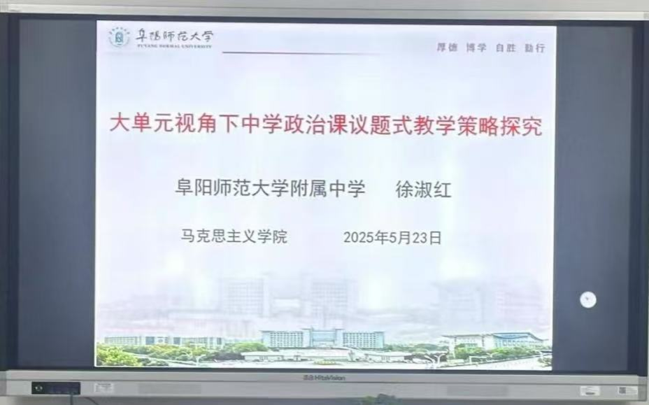 5月23日上午,学院特邀阜阳师范大学附属中学正高级教师徐淑红,在学院102教室作题为《大单元视角下中学政治课议题式教学策略探究》的专题讲座。活动由陈甲甲老师主持,24级学科教学(思政)研究生全员参与。