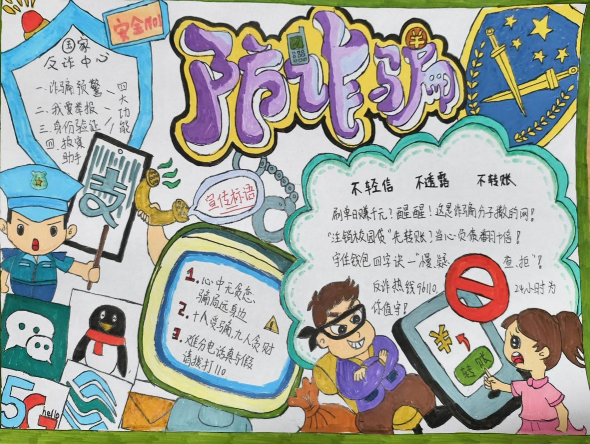 活动期间,同学们充分发挥想象力与创造力,围绕电信诈骗、网络诈骗、校园贷诈骗等常见诈骗类型,通过生动的漫画、醒目的标语等形式,将反诈知识巧妙融入到手抄报创作中,绘制出一幅幅兼具教育意义与艺术美感的作品。