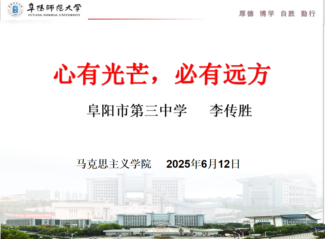 6月12日上午,学院特邀阜阳市第三中学高级教师李传胜,在学院102教室作题为《心有光芒,必有远方》的专题讲座。活动由陈甲甲老师主持,24级学科教学(思政)研究生全员参与。
