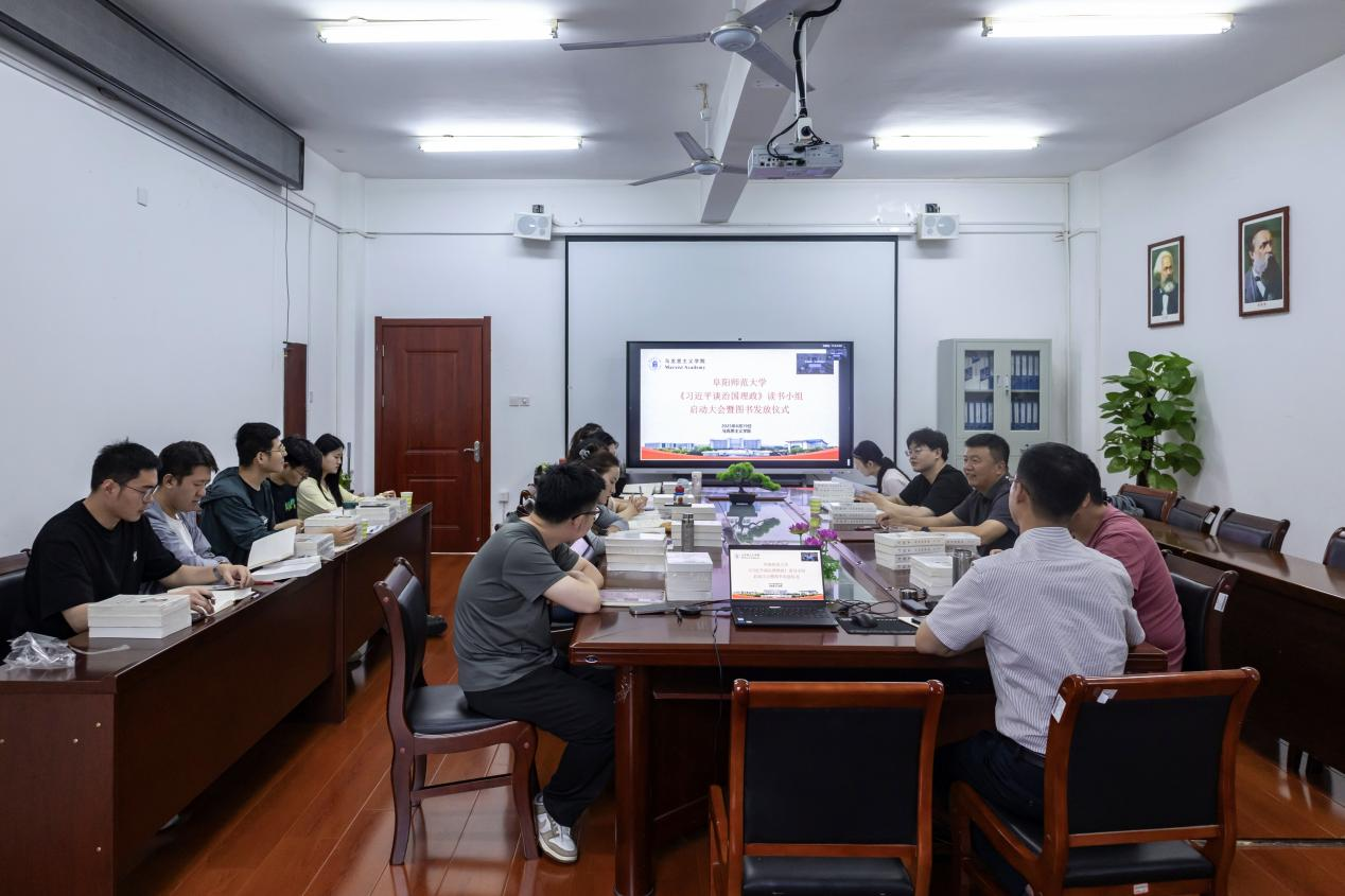 6月19日上午,中国高等教育学会马克思主义研究分会、中国李大钊研究会2025年度“马克思主义经典著作研读”中共党史党建专项支持计划——阜阳师范大学《习近平谈治国理政》读书小组在马克思主义学院211会议室举行启动仪式暨第一次线下读书活动。本次活动邀请了学院党委委员、副院长赵永明教授和学院研究生秘书韩旭副教授莅临指导。活动由刘美晨同学主持,黄金林、周蒙蒙、郭蘅瑶等14位读书小组成员参加。活动主要分为授书仪式、指导老师致辞、分享学习心得、交流感悟等部分。