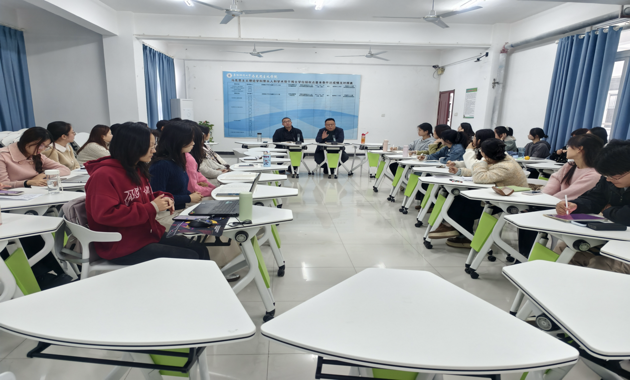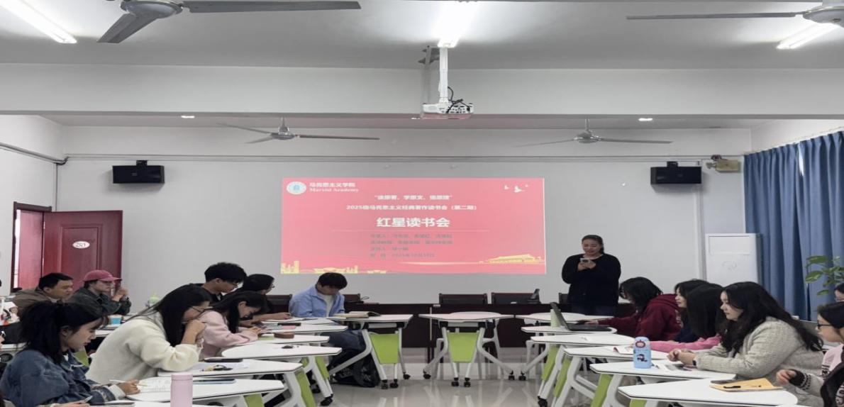 为积极响应习近平总书记提出的“读原著、学原文、悟原理”,进一步营造“爱读书、读好书、善读书”的浓厚氛围,使马院学子增长知识、增加智慧、增强本领,学院2025级马克思主义理论研究生“红星读书会”第二期分享活动于10月30日在三里桥校区201教室开展。本次会议邀请李强老师、梁华玮老师担任指导。会议由徐小喻主持,刁天池、朱慧红、汪青松三位同学分享阅读感悟。