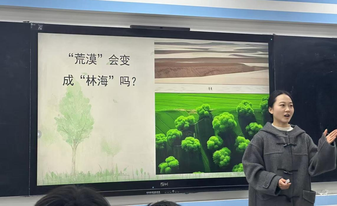 活动中,两位同学共同围绕高中思想政治选择性必修三《逻辑与思维》中“质量互变规律的含义”这一课题,从不同视角展开探讨。张寒星以“高铁的发展历程”为切入点,讲授其中蕴含的质与量的辩证关系,并进一步结合同学们学习英语的切身经验,生动阐释了量变积累引起质变的哲学原理;邢鑫鑫以“塞罕坝的绿色奇迹”为例,通过一系列真实数据,清晰呈现了这片土地从荒漠到林海的量变与质变历程。