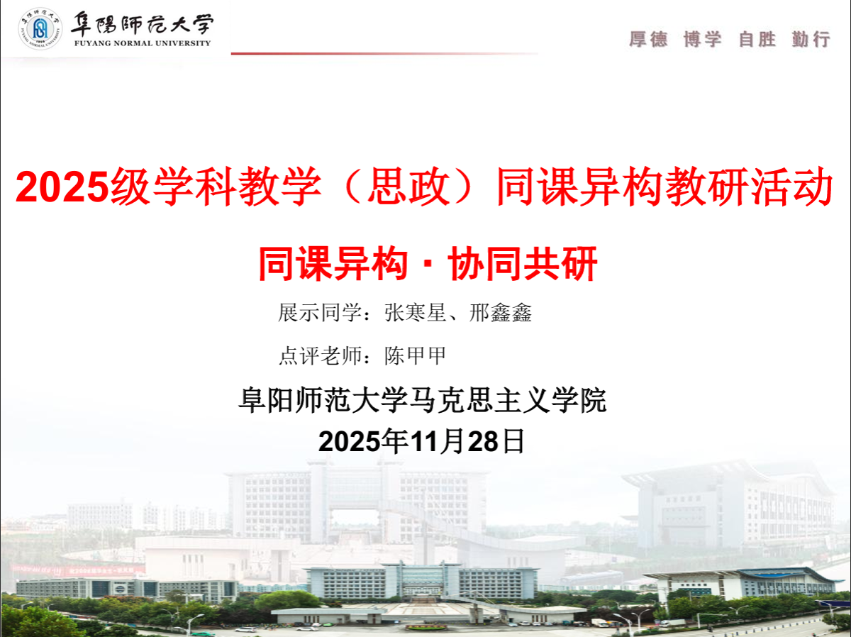 为持续提升学科教学(思政)研究生的教学技能,11月28日上午在马克思主义学院305教室举办了2025级学科教学(思政)专业第二次同课异构活动。本次活动陈甲甲老师到会指导,2025级学科教学(思政)全体研究生参加,活动由彭新宇主持。