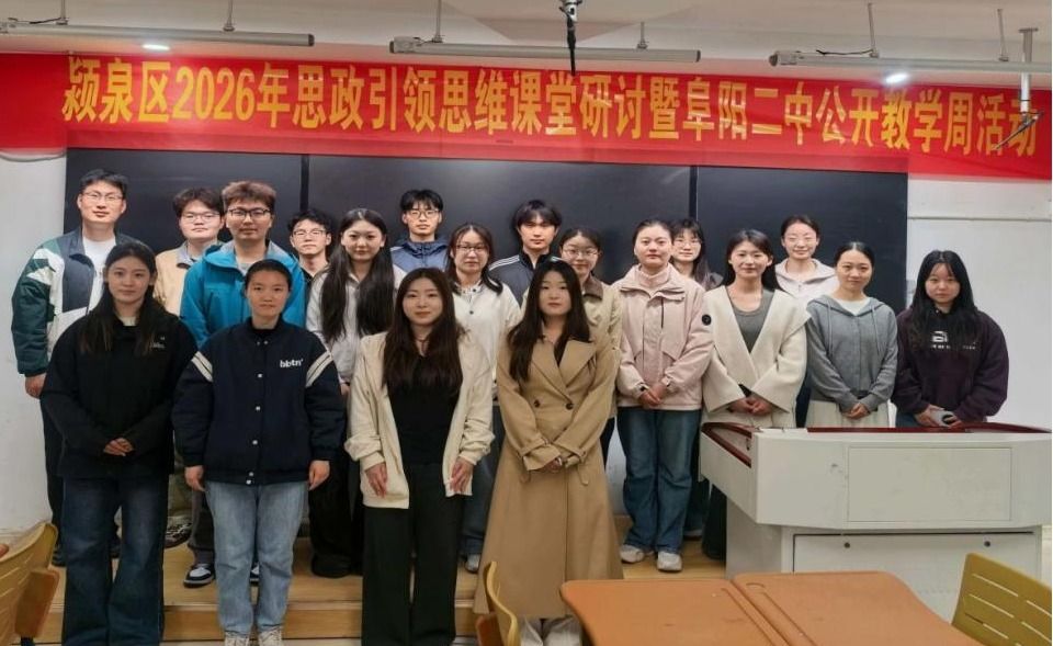 同课异构,共探思政课堂;以评促教,精进育人本领。4月14日下午,25级学科教学(思政)全体研究生及24级实习研究生,在陈甲甲老师的组织下,前往阜阳二中参加颍泉区2026年思政引领思维课堂研讨暨阜阳二中公开教学周活动。